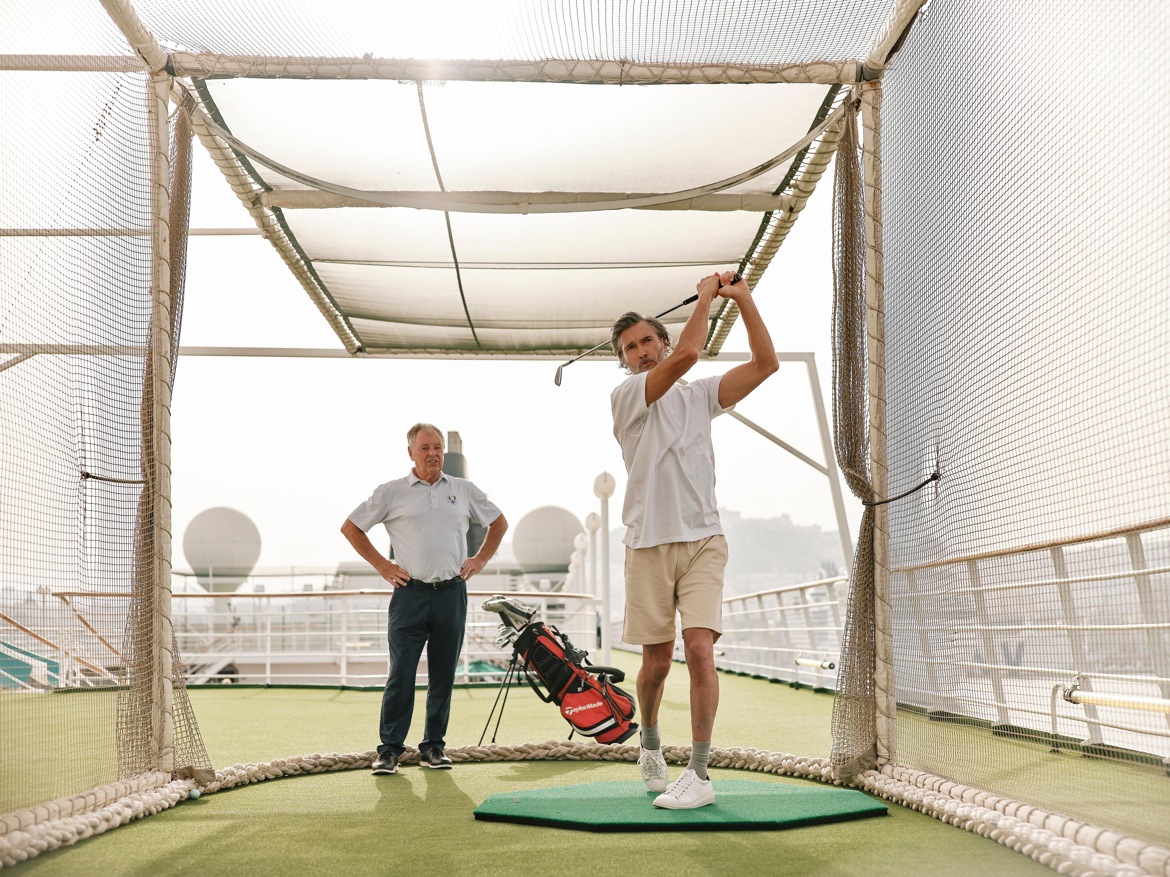 What can you expect from one of Crystal’s complimentary golf clinics? They are a brilliant way to get an introduction to the game or build on your existing experience. A first-timer tees off onboard.